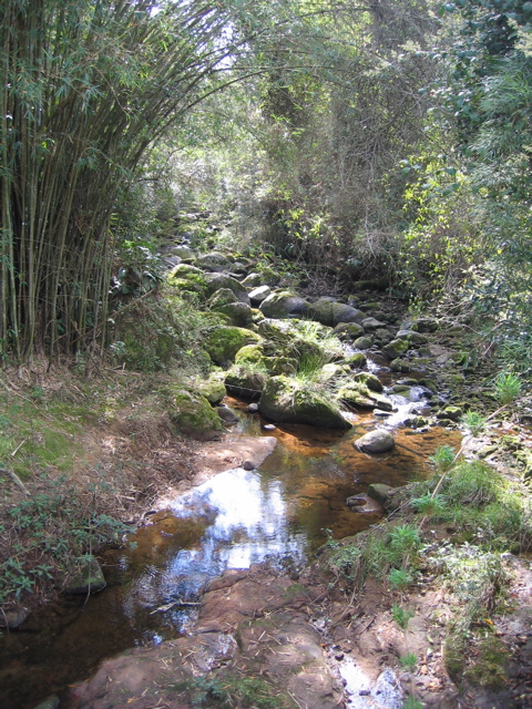 Nosso terreno é composto por 15 alquieres (aprox. 36 hectares ou 90 acres) sobre o Rio Manso, um rio pequeno. Inclui prados e floresta, um pomar, horta, várias nascentes e uma casa grande. Originalmente coberto por Mata Atlântica, o terreno foi desmatado para a agricultura há algum tempo, e agora está em vários estágios de reflorestamento natural. |